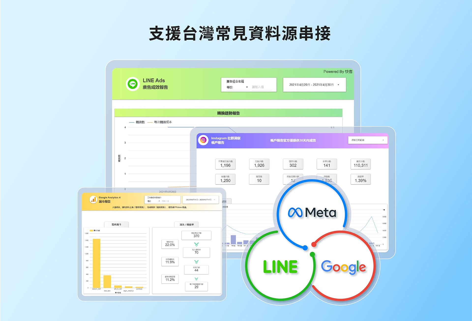 掌握台灣絕大多數位行銷企業,分析報表的習慣,提供完整中文指標選擇,一鍵引入範本設定。
