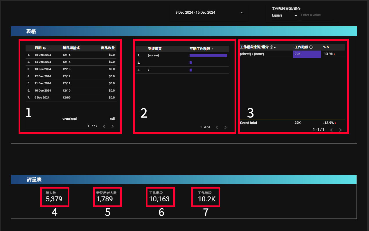 例如拖拉新的評量表 (上方圖片4,5,6,7),把工作階段換成使用者,這樣也會再重新消耗1次API的使用量。或是選擇新的視覺化模組 (上方圖片1,2,3) 這樣也會再算1次API消耗量。而如果一個模組同時有多個維度、指標,這樣也只算消耗1次的API使用量。