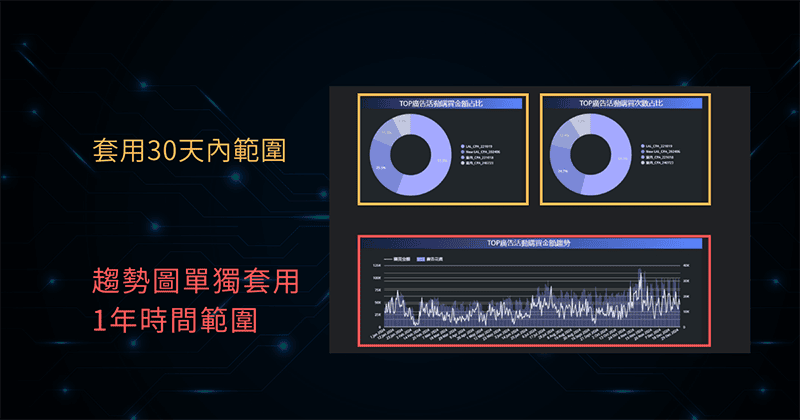 例如,時間趨勢圖索取1年的資料,其他圖表則是可以再額外拉時間範圍。 (參考範例圖)