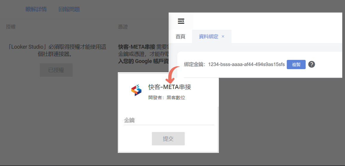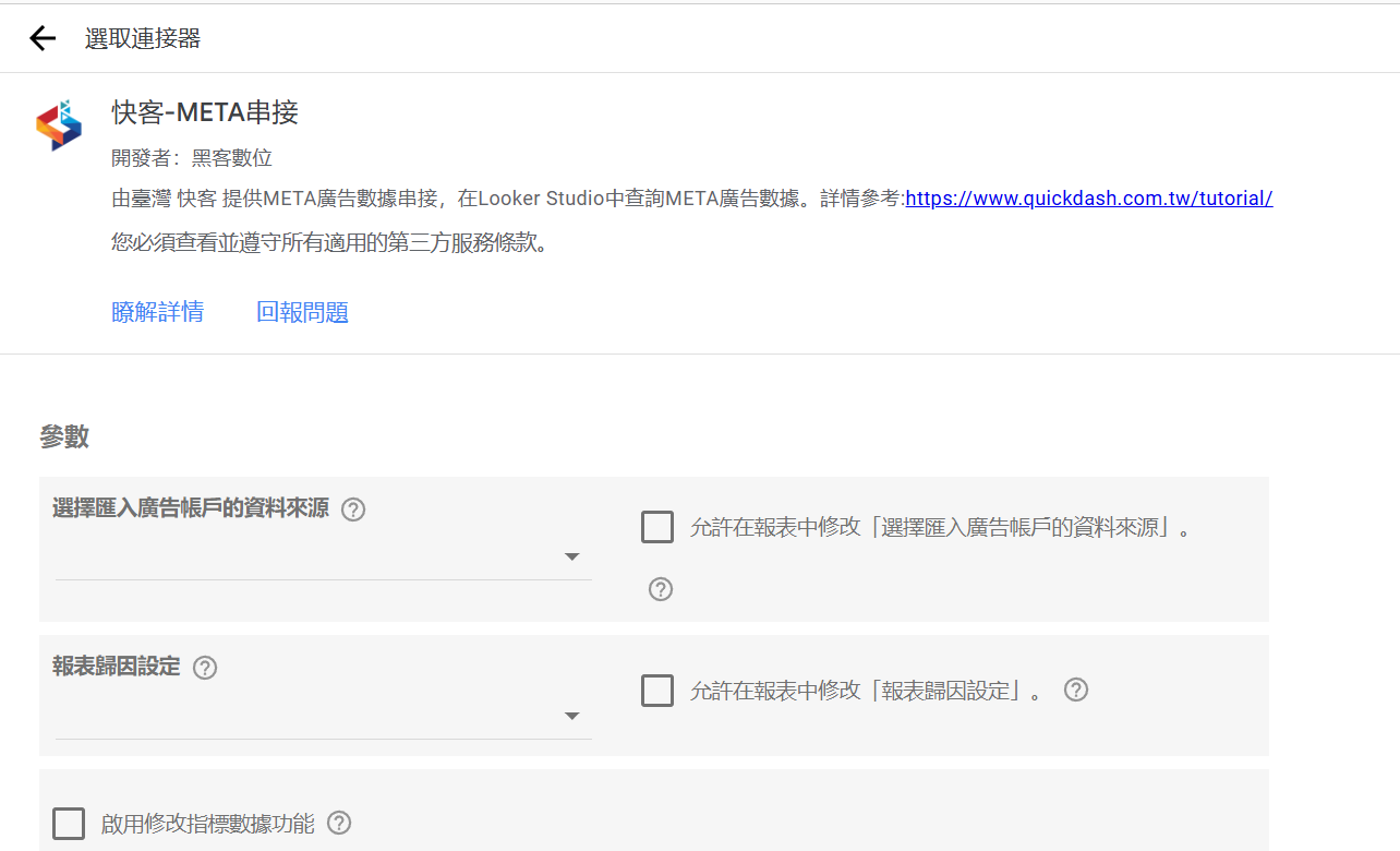 快速開始 3分鐘導入數據至 Looker Studio。 立即串接報表 1. 註冊快客會員 提供永久免費註冊會員。 2. 連結資料源 進入資料綁定頁面,綁定您要連接的資料源。 3. 前往 Looker Studio 將快客後台的密鑰貼至LookerStudio 中以進行驗證。 4. 完成! 開始使用 開始整合數據、社群帳號等資料源。 其他補充資訊 如果您還想進一步了解,可以繼續往下看。看完上面的教學,您已經可以進行數據導入! 綁定密鑰 此密鑰為驗證的重要密鑰。勿將此密鑰提供給不信任的人士。快客遵守META使用規範。無權修改/檢視帳號的詳細資料。 設定技巧 1 任選綁定廣告帳號,Looker Studio 以這帳號呈現數據。(顯示帳號與快客綁定帳號連動) 設定技巧 2 勾選後,可在Looker Studio中切換連結帳號。 設定技巧 3 可切換META廣告數據歸因。 設定技巧 4 可直接修改META廣告數據。(CPC, 購買金額, Roas…等。)